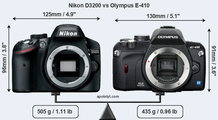 An illustration of the physical size and weight of the Nikon D3200 and the Olympus E-410 is provided in the side-by-side display below. The two cameras are presented according to their relative size. Three consecutive perspectives from the front, the top, and the back are available. All size dimensions are rounded to the nearest millimeter.