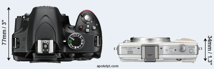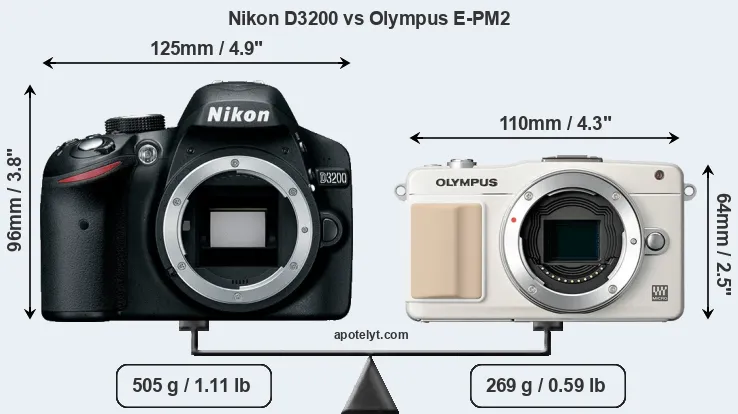 The physical size and weight of the Nikon D3200 and the Olympus E-PM2 are illustrated in the side-by-side display below. The two cameras are presented according to their relative size. Three consecutive views from the front, the top, and the rear side are shown. All size dimensions are rounded to the nearest millimeter.