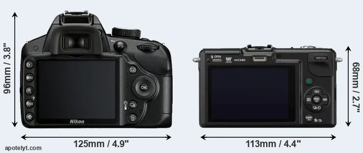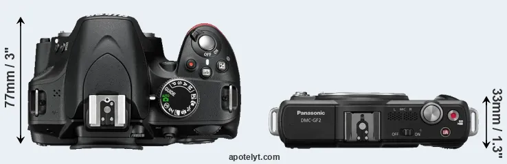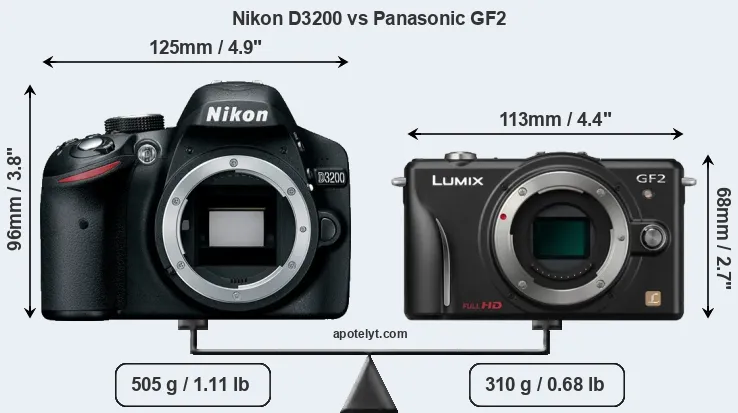 The side-by-side display below illustrates the physical size and weight of the Nikon D3200 and the Panasonic GF2. The two cameras are presented according to their relative size. Three consecutive views from the front, the top, and the rear side are shown. All width, height and depth dimensions are rounded to the nearest millimeter.