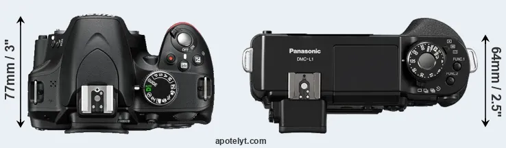 The physical size and weight of the Nikon D3200 and the Panasonic L1 are illustrated in the side-by-side display below. The two cameras are presented according to their relative size. Three successive views from the front, the top, and the rear are shown. All width, height and depth dimensions are rounded to the nearest millimeter.