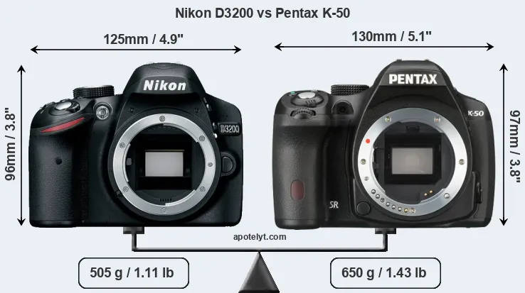 If the front view area (width x height) of the cameras is taken as an aggregate measure of their size, the Pentax K-50 is somewhat larger (5 percent) than the Nikon D3200. Moreover, the K-50 is markedly heavier (29 percent) than the D3200. It is noteworthy in this context that the K-50 is splash and dust-proof, while the D3200 does not feature any corresponding weather-sealing.