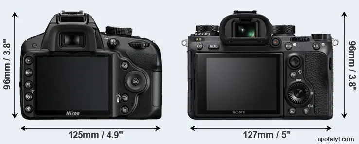 If the front view area (width x height) of the cameras is taken as an aggregate measure of their size, the Sony A9 is somewhat larger (2 percent) than the Nikon D3200. Moreover, the A9 is markedly heavier (33 percent) than the D3200. It is noteworthy in this context that the A9 is splash and dust-proof, while the D3200 does not feature any corresponding weather-sealing.