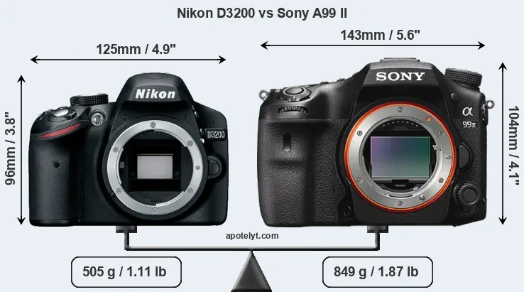 The physical size and weight of the Nikon D3200 and the Sony A99 II are illustrated in the side-by-side display below. The two cameras are presented according to their relative size. Three consecutive perspectives from the front, the top, and the back are available. All width, height and depth measures are rounded to the nearest millimeter.