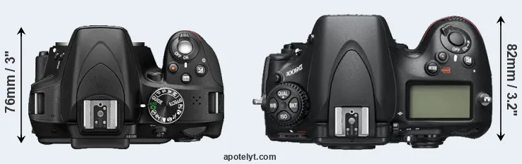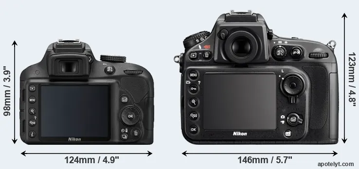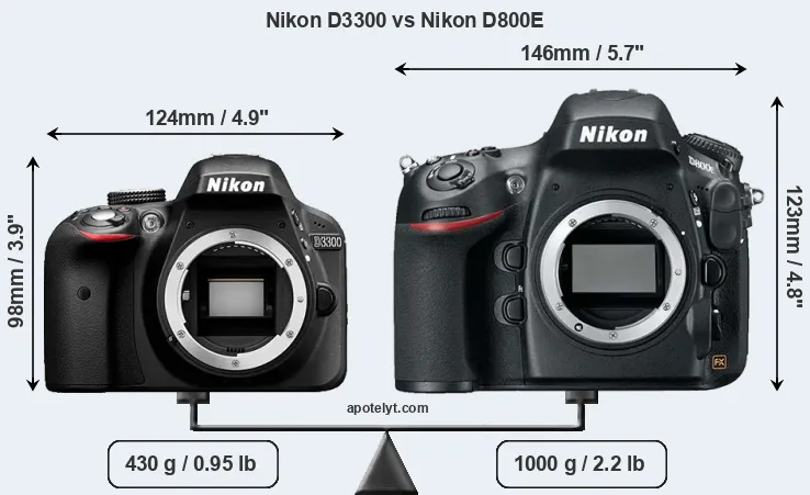 An illustration of the physical size and weight of the Nikon D3300 and the Nikon D800E is provided in the side-by-side display below. The two cameras are presented according to their relative size. Three consecutive perspectives from the front, the top, and the back are available. All width, height and depth measures are rounded to the nearest millimeter.