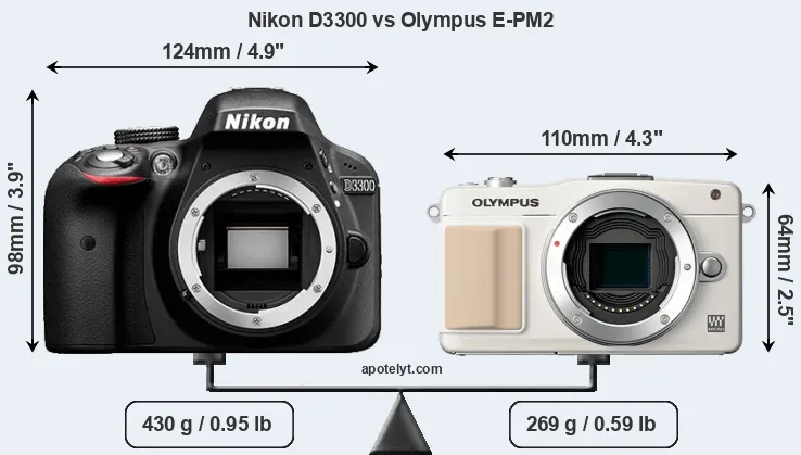 An illustration of the physical size and weight of the Nikon D3300 and the Olympus E-PM2 is provided in the side-by-side display below. The two cameras are presented according to their relative size. Three successive views from the front, the top, and the rear are shown. All width, height and depth dimensions are rounded to the nearest millimeter.