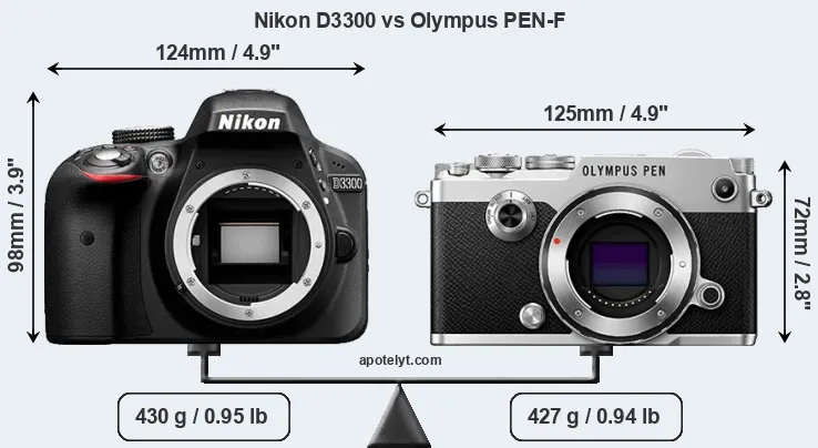 An illustration of the physical size and weight of the Nikon D3300 and the Olympus PEN-F is provided in the side-by-side display below. The two cameras are presented according to their relative size. Three successive views from the front, the top, and the rear are shown. All width, height and depth dimensions are rounded to the nearest millimeter.
