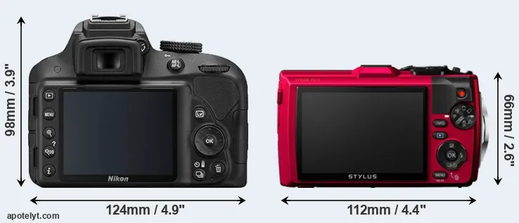 The side-by-side display below illustrates the physical size and weight of the Nikon D3300 and the Olympus TG-4. The two cameras are presented according to their relative size. Three consecutive views from the front, the top, and the rear side are shown. All width, height and depth dimensions are rounded to the nearest millimeter.