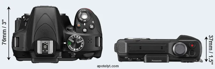 The physical size and weight of the Nikon D3300 and the Panasonic FT7 are illustrated in the side-by-side display below. The two cameras are presented according to their relative size. Three successive views from the front, the top, and the rear are shown. All size dimensions are rounded to the nearest millimeter.