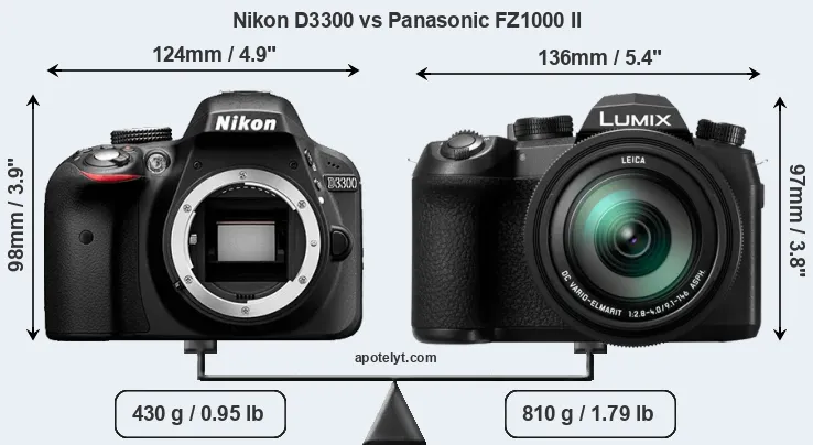 The physical size and weight of the Nikon D3300 and the Panasonic FZ1000 II are illustrated in the side-by-side display below. The two cameras are presented according to their relative size. Three consecutive perspectives from the front, the top, and the back are available. All width, height and depth dimensions are rounded to the nearest millimeter.