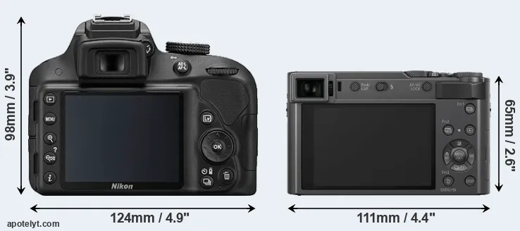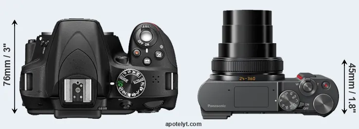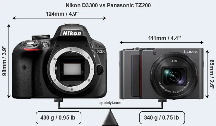 The side-by-side display below illustrates the physical size and weight of the Nikon D3300 and the Panasonic TZ200. The two cameras are presented according to their relative size. Three consecutive perspectives from the front, the top, and the back are available. All width, height and depth measures are rounded to the nearest millimeter.