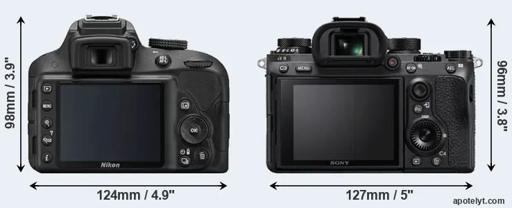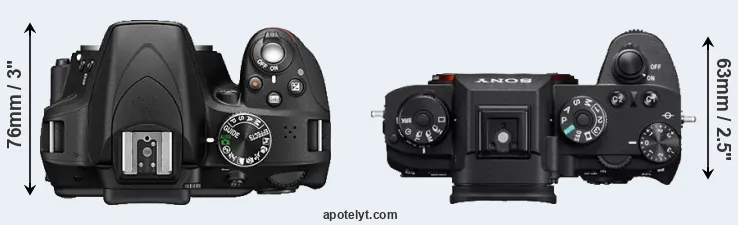 The side-by-side display below illustrates the physical size and weight of the Nikon D3300 and the Sony A9. The two cameras are presented according to their relative size. Three consecutive perspectives from the front, the top, and the back are available. All width, height and depth measures are rounded to the nearest millimeter.
