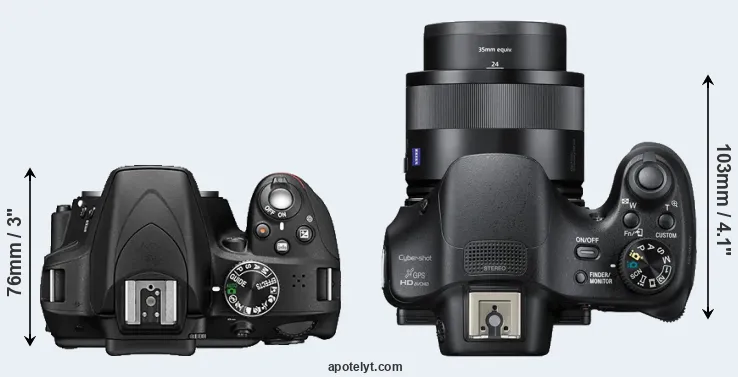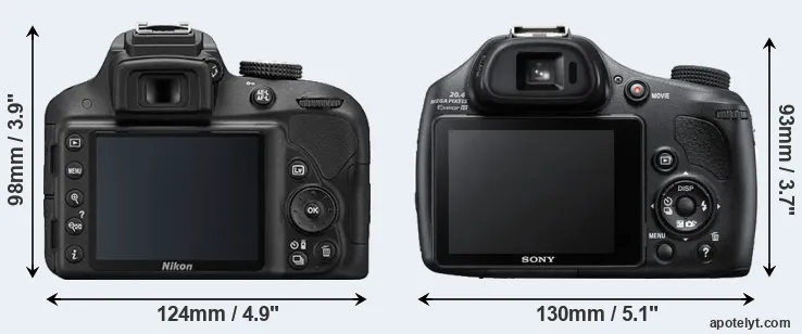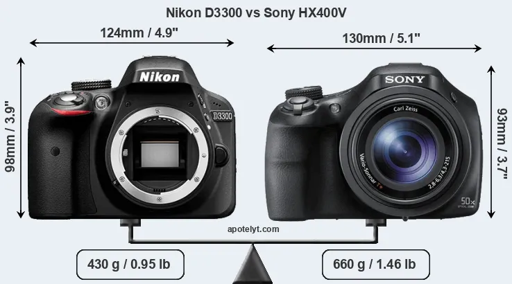 The side-by-side display below illustrates the physical size and weight of the Nikon D3300 and the Sony HX400V. The two cameras are presented according to their relative size. Three consecutive views from the front, the top, and the rear side are shown. All width, height and depth measures are rounded to the nearest millimeter.