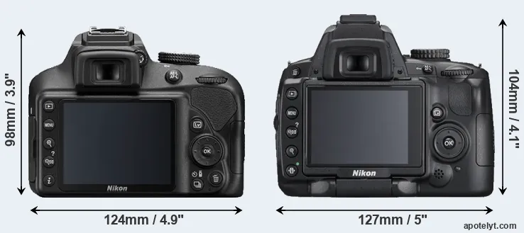 An illustration of the physical size and weight of the Nikon D3400 and the Nikon D5000 is provided in the side-by-side display below. The two cameras are presented according to their relative size. Three successive views from the front, the top, and the rear are shown. All width, height and depth dimensions are rounded to the nearest millimeter.