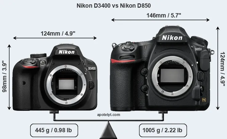 The physical size and weight of the Nikon D3400 and the Nikon D850 are illustrated in the side-by-side display below. The two cameras are presented according to their relative size. Three consecutive perspectives from the front, the top, and the back are available. All size dimensions are rounded to the nearest millimeter.
