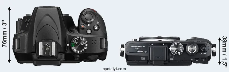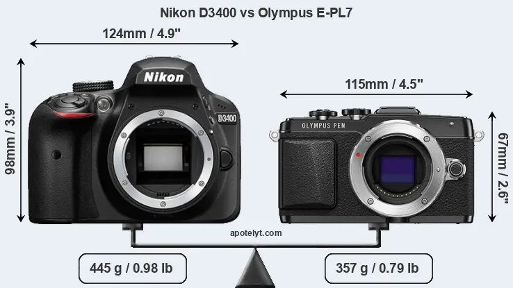 The physical size and weight of the Nikon D3400 and the Olympus E-PL7 are illustrated in the side-by-side display below. The two cameras are presented according to their relative size. Three consecutive perspectives from the front, the top, and the back are available. All width, height and depth dimensions are rounded to the nearest millimeter.