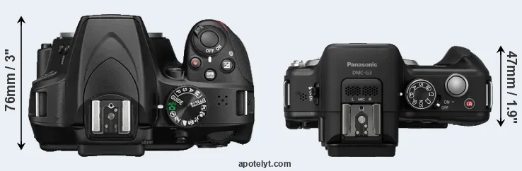 The side-by-side display below illustrates the physical size and weight of the Nikon D3400 and the Panasonic G3. The two cameras are presented according to their relative size. Three successive views from the front, the top, and the rear are shown. All width, height and depth dimensions are rounded to the nearest millimeter.