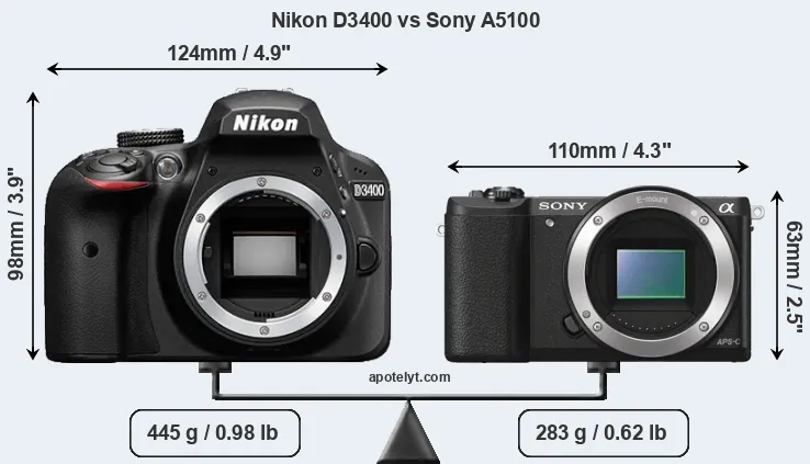 An illustration of the physical size and weight of the Nikon D3400 and the Sony A5100 is provided in the side-by-side display below. The two cameras are presented according to their relative size. Three successive views from the front, the top, and the rear are shown. All width, height and depth measures are rounded to the nearest millimeter.