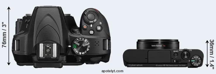 The physical size and weight of the Nikon D3400 and the Sony WX800 are illustrated in the side-by-side display below. The two cameras are presented according to their relative size. Three consecutive views from the front, the top, and the rear side are shown. All size dimensions are rounded to the nearest millimeter.