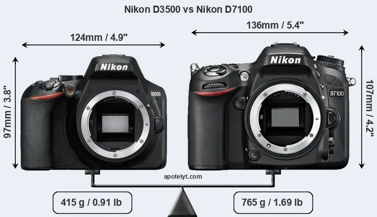 If the front view area (width x height) of the cameras is taken as an aggregate measure of their size, the Nikon D7100 is notably larger (21 percent) than the Nikon D3500. Moreover, the D7100 is substantially heavier (84 percent) than the D3500. It is noteworthy in this context that the D7100 is splash and dust-proof, while the D3500 does not feature any corresponding weather-sealing.