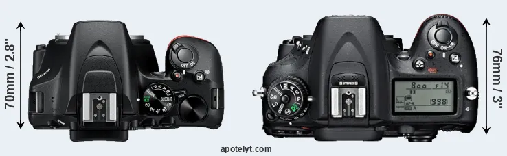 The physical size and weight of the Nikon D3500 and the Nikon D7100 are illustrated in the side-by-side display below. The two cameras are presented according to their relative size. Three successive views from the front, the top, and the rear are shown. All width, height and depth dimensions are rounded to the nearest millimeter.
