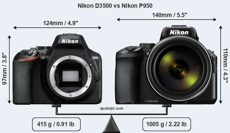 The side-by-side display below illustrates the physical size and weight of the Nikon D3500 and the Nikon P950. The two cameras are presented according to their relative size. Three successive views from the front, the top, and the rear are shown. All width, height and depth measures are rounded to the nearest millimeter.