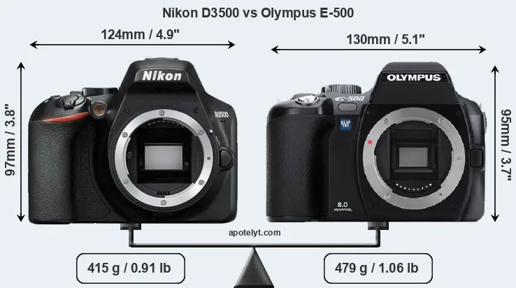 An illustration of the physical size and weight of the Nikon D3500 and the Olympus E-500 is provided in the side-by-side display below. The two cameras are presented according to their relative size. Three consecutive perspectives from the front, the top, and the back are available. All width, height and depth dimensions are rounded to the nearest millimeter.
