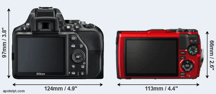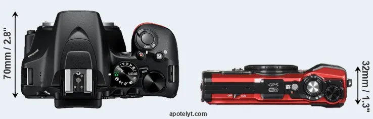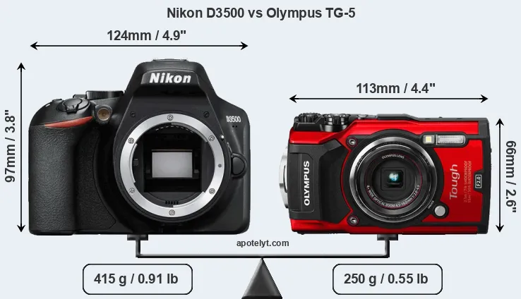 The physical size and weight of the Nikon D3500 and the Olympus TG-5 are illustrated in the side-by-side display below. The two cameras are presented according to their relative size. Three consecutive perspectives from the front, the top, and the back are available. All width, height and depth dimensions are rounded to the nearest millimeter.