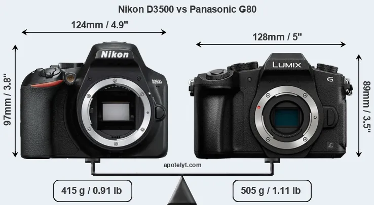 If the front view area (width x height) of the cameras is taken as an aggregate measure of their size, the Panasonic G80 is notably smaller (5 percent) than the Nikon D3500. However, the G80 is markedly heavier (22 percent) than the D3500. It is noteworthy in this context that the G80 is splash and dust-proof, while the D3500 does not feature any corresponding weather-sealing.