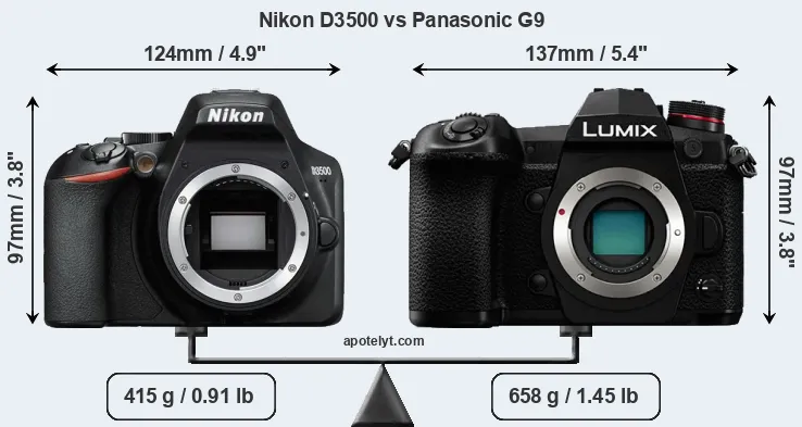 If the front view area (width x height) of the cameras is taken as an aggregate measure of their size, the Panasonic G9 is notably larger (10 percent) than the Nikon D3500. Moreover, the G9 is substantially heavier (59 percent) than the D3500. It is noteworthy in this context that the G9 is splash and dust-proof, while the D3500 does not feature any corresponding weather-sealing.