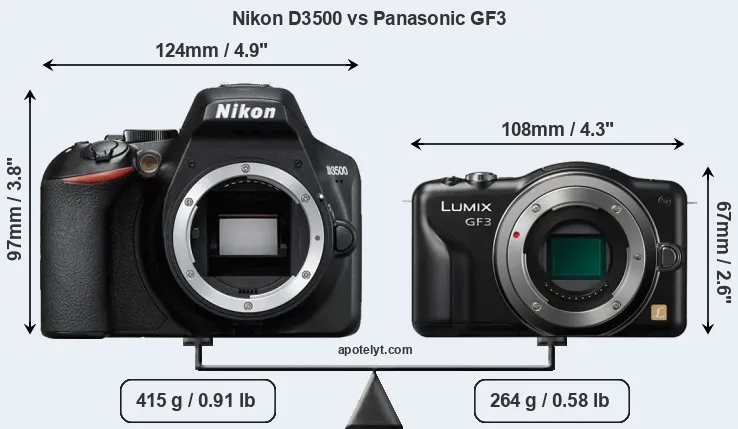 An illustration of the physical size and weight of the Nikon D3500 and the Panasonic GF3 is provided in the side-by-side display below. The two cameras are presented according to their relative size. Three successive views from the front, the top, and the rear are shown. All size dimensions are rounded to the nearest millimeter.