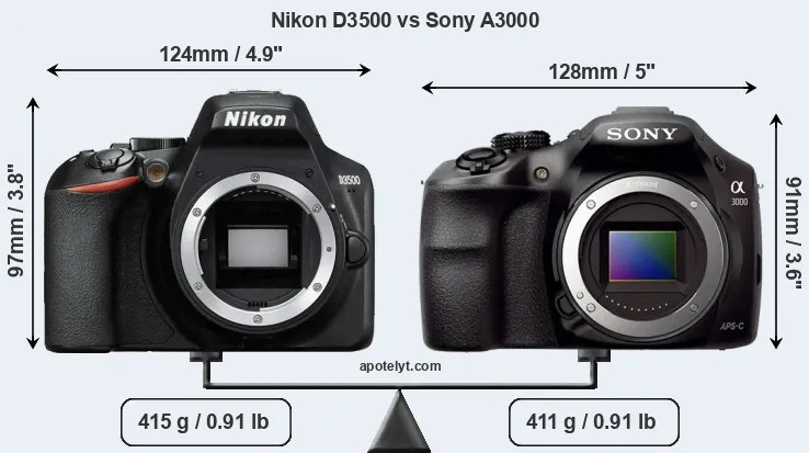 An illustration of the physical size and weight of the Nikon D3500 and the Sony A3000 is provided in the side-by-side display below. The two cameras are presented according to their relative size. Three successive views from the front, the top, and the rear are shown. All width, height and depth dimensions are rounded to the nearest millimeter.