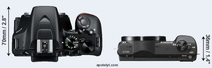 The side-by-side display below illustrates the physical size and weight of the Nikon D3500 and the Sony A5100. The two cameras are presented according to their relative size. Three consecutive views from the front, the top, and the rear side are shown. All width, height and depth dimensions are rounded to the nearest millimeter.