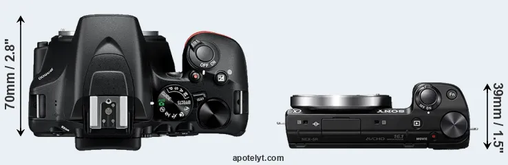 The side-by-side display below illustrates the physical size and weight of the Nikon D3500 and the Sony NEX-5R. The two cameras are presented according to their relative size. Three consecutive views from the front, the top, and the rear side are shown. All width, height and depth measures are rounded to the nearest millimeter.