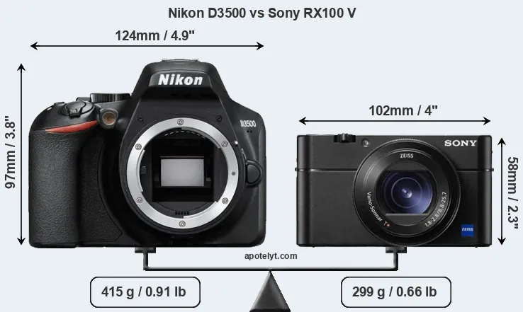 An illustration of the physical size and weight of the Nikon D3500 and the Sony RX100 V is provided in the side-by-side display below. The two cameras are presented according to their relative size. Three consecutive perspectives from the front, the top, and the back are available. All size dimensions are rounded to the nearest millimeter.