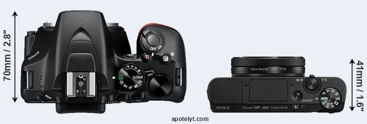 The above size and weight comparisons are to some extent incomplete and possibly misleading, as the RX100 V has a lens built in, whereas the D3500 is an interchangeable lens camera that requires a separate lens. Attaching the latter will add extra weight and bulk to the setup. You can compare the optics available for the D3500 and their specifications in the Nikon Lens Catalog.