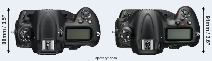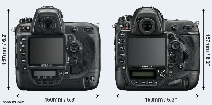 The physical size and weight of the Nikon D3S and the Nikon D4S are illustrated in the side-by-side display below. The two cameras are presented according to their relative size. Three successive views from the front, the top, and the rear are shown. All width, height and depth measures are rounded to the nearest millimeter.