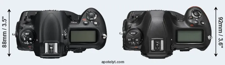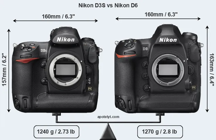The physical size and weight of the Nikon D3S and the Nikon D6 are illustrated in the side-by-side display below. The two cameras are presented according to their relative size. Three successive views from the front, the top, and the rear are shown. All width, height and depth dimensions are rounded to the nearest millimeter.