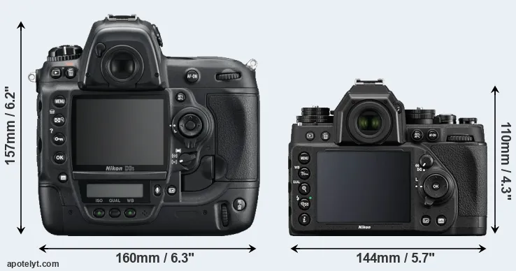 An illustration of the physical size and weight of the Nikon D3S and the Nikon Df is provided in the side-by-side display below. The two cameras are presented according to their relative size. Three successive views from the front, the top, and the rear are shown. All width, height and depth dimensions are rounded to the nearest millimeter.