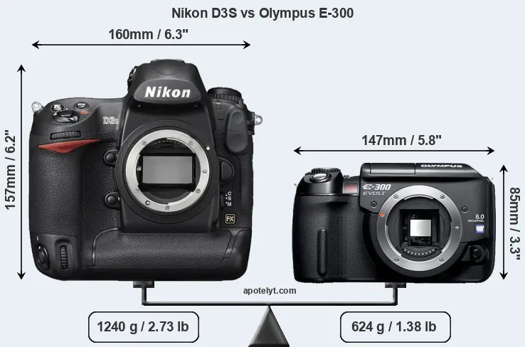 The side-by-side display below illustrates the physical size and weight of the Nikon D3S and the Olympus E-300. The two cameras are presented according to their relative size. Three successive views from the front, the top, and the rear are shown. All size dimensions are rounded to the nearest millimeter.