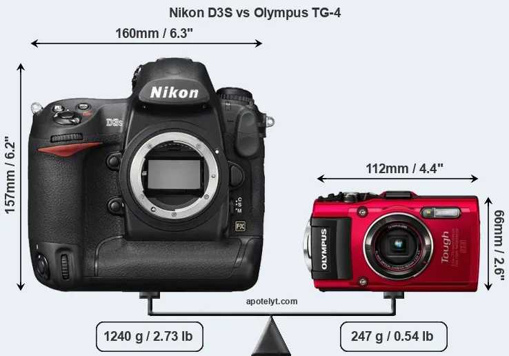 An illustration of the physical size and weight of the Nikon D3S and the Olympus TG-4 is provided in the side-by-side display below. The two cameras are presented according to their relative size. Three successive views from the front, the top, and the rear are shown. All width, height and depth dimensions are rounded to the nearest millimeter.