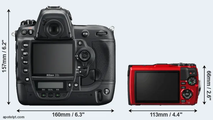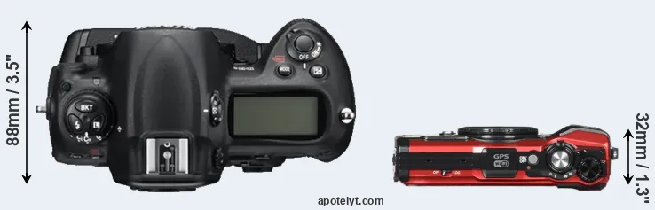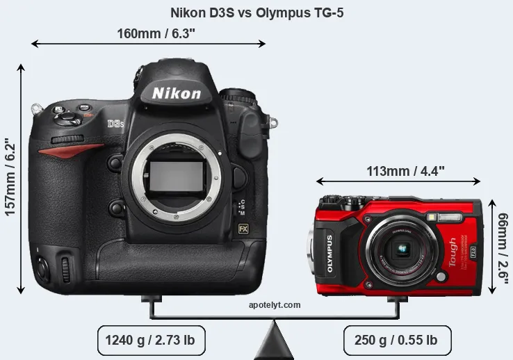 The physical size and weight of the Nikon D3S and the Olympus TG-5 are illustrated in the side-by-side display below. The two cameras are presented according to their relative size. Three consecutive perspectives from the front, the top, and the back are available. All width, height and depth dimensions are rounded to the nearest millimeter.