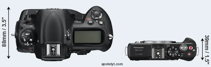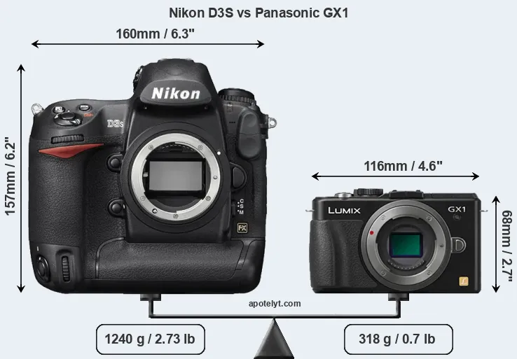 An illustration of the physical size and weight of the Nikon D3S and the Panasonic GX1 is provided in the side-by-side display below. The two cameras are presented according to their relative size. Three consecutive views from the front, the top, and the rear side are shown. All width, height and depth measures are rounded to the nearest millimeter.