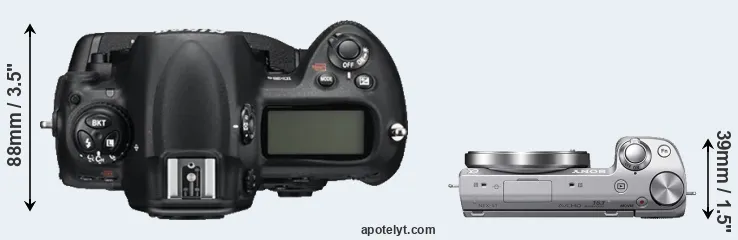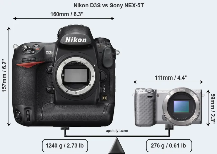 The side-by-side display below illustrates the physical size and weight of the Nikon D3S and the Sony NEX-5T. The two cameras are presented according to their relative size. Three consecutive views from the front, the top, and the rear side are shown. All size dimensions are rounded to the nearest millimeter.