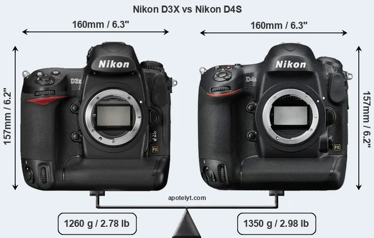An illustration of the physical size and weight of the Nikon D3X and the Nikon D4S is provided in the side-by-side display below. The two cameras are presented according to their relative size. Three successive views from the front, the top, and the rear are shown. All width, height and depth dimensions are rounded to the nearest millimeter.