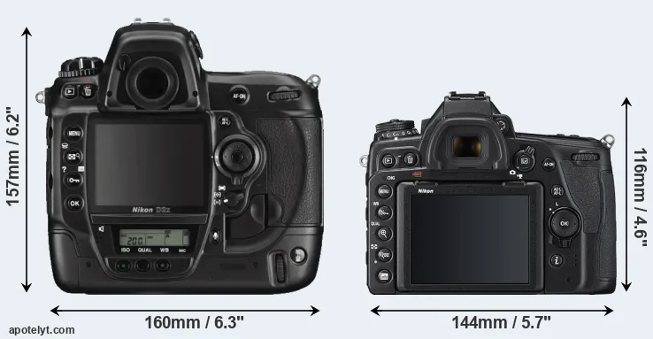 An illustration of the physical size and weight of the Nikon D3X and the Nikon D780 is provided in the side-by-side display below. The two cameras are presented according to their relative size. Three consecutive perspectives from the front, the top, and the back are available. All width, height and depth measures are rounded to the nearest millimeter.