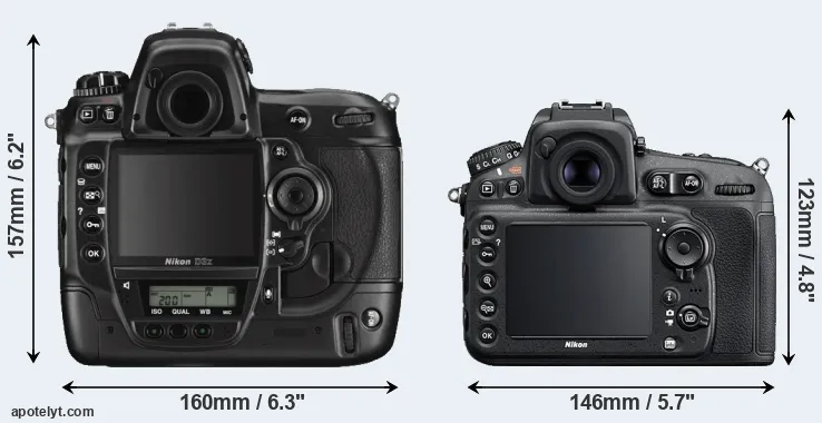 An illustration of the physical size and weight of the Nikon D3X and the Nikon D810 is provided in the side-by-side display below. The two cameras are presented according to their relative size. Three consecutive views from the front, the top, and the rear side are shown. All width, height and depth dimensions are rounded to the nearest millimeter.