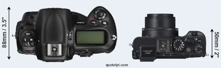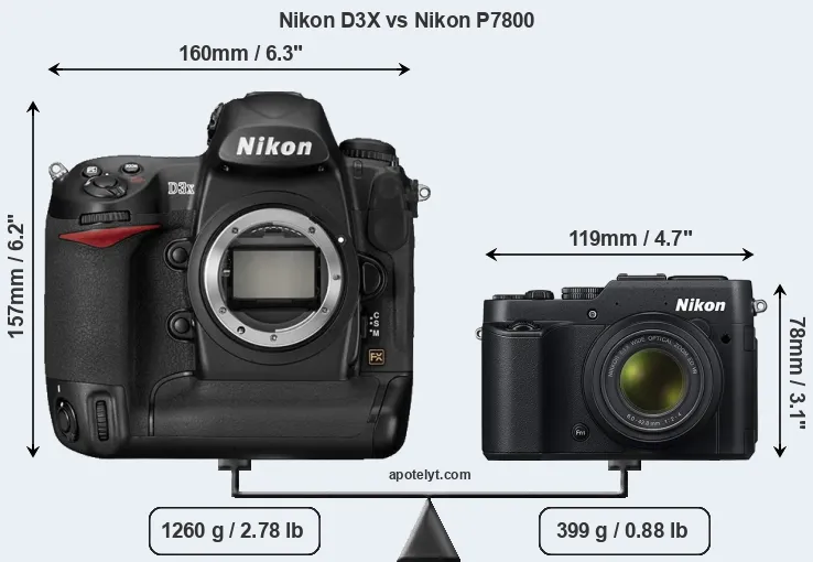 An illustration of the physical size and weight of the Nikon D3X and the Nikon P7800 is provided in the side-by-side display below. The two cameras are presented according to their relative size. Three consecutive views from the front, the top, and the rear side are shown. All width, height and depth measures are rounded to the nearest millimeter.