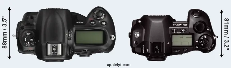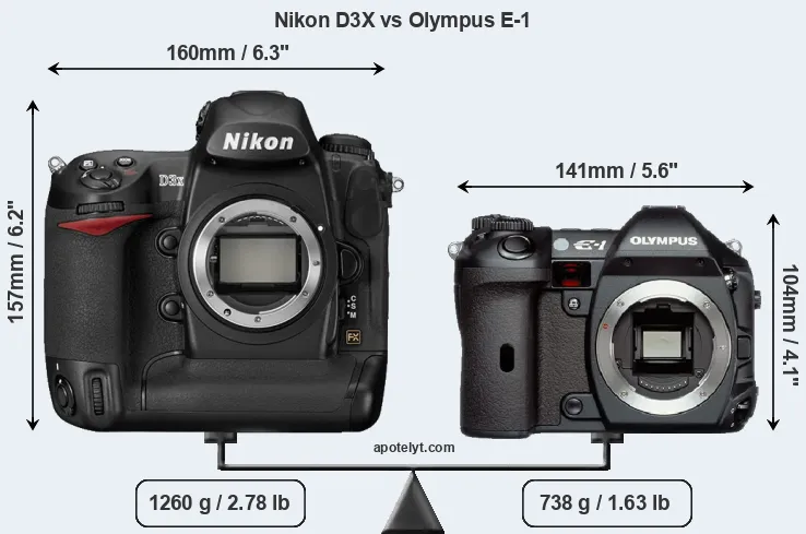 An illustration of the physical size and weight of the Nikon D3X and the Olympus E-1 is provided in the side-by-side display below. The two cameras are presented according to their relative size. Three consecutive perspectives from the front, the top, and the back are available. All width, height and depth measures are rounded to the nearest millimeter.
