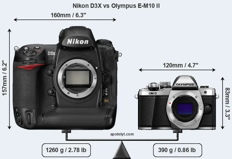 The physical size and weight of the Nikon D3X and the Olympus E-M10 II are illustrated in the side-by-side display below. The two cameras are presented according to their relative size. Three successive views from the front, the top, and the rear are shown. All width, height and depth measures are rounded to the nearest millimeter.