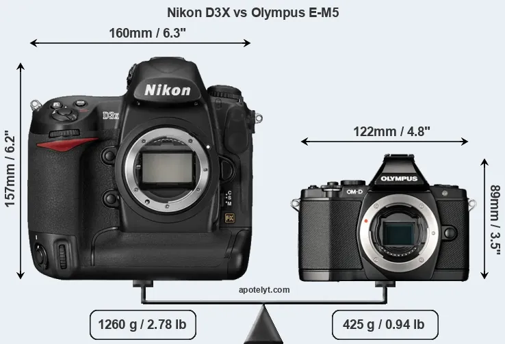 An illustration of the physical size and weight of the Nikon D3X and the Olympus E-M5 is provided in the side-by-side display below. The two cameras are presented according to their relative size. Three consecutive perspectives from the front, the top, and the back are available. All size dimensions are rounded to the nearest millimeter.
